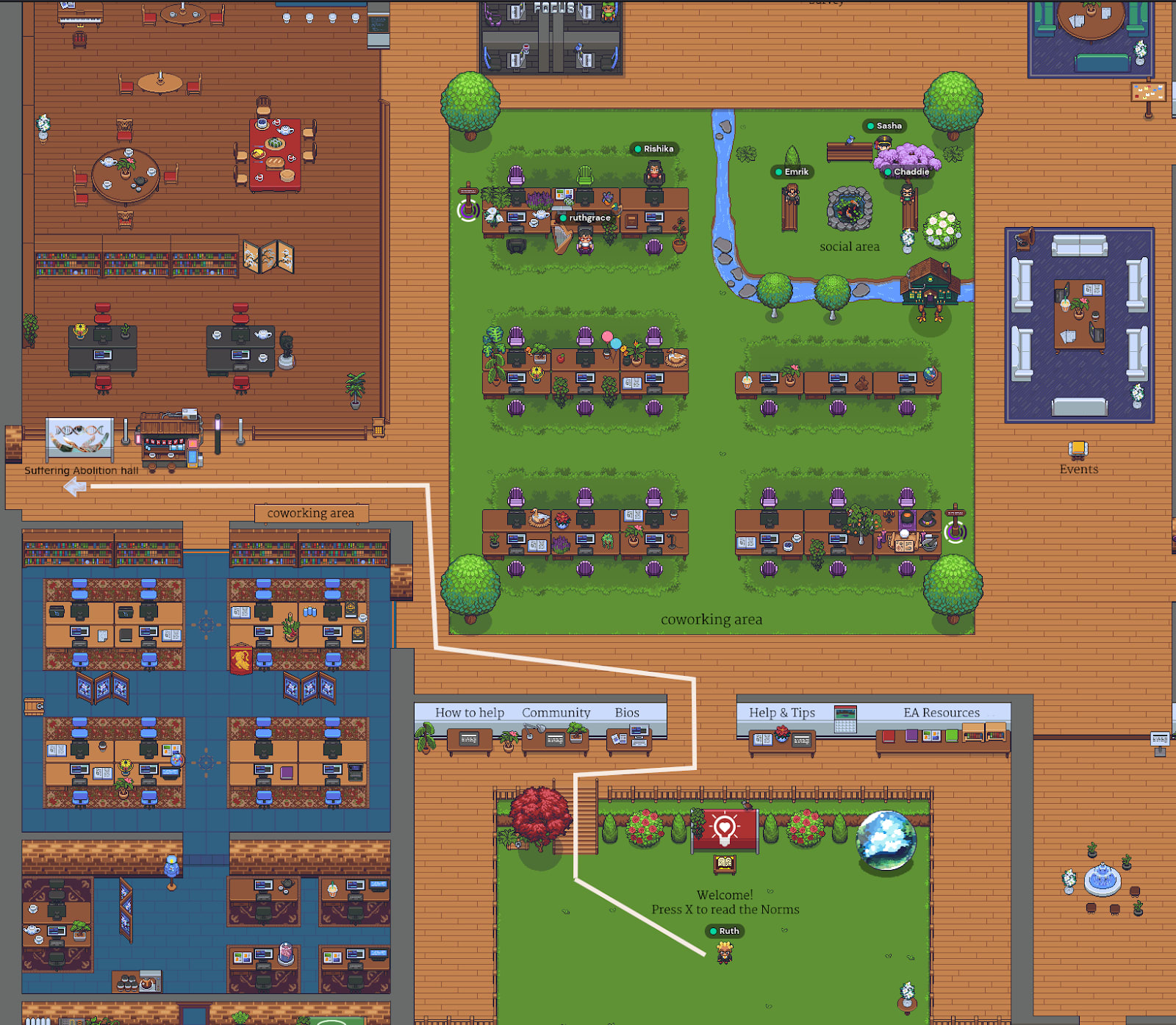 1. The first 10 min people have time to navigate, get our support if needed and gather in the meetup area of the Suffering Abolition hall.