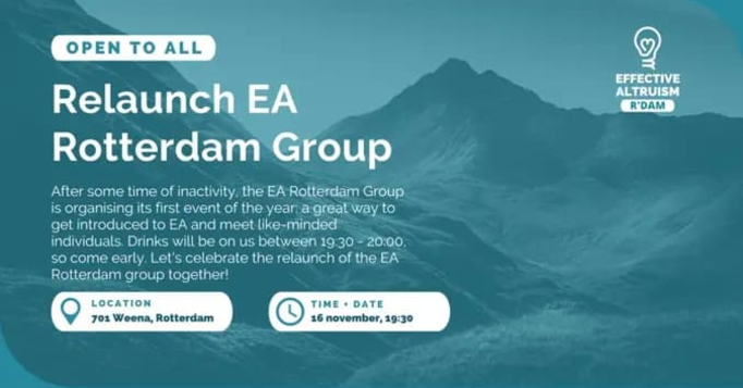 Some introductory talks on EA will be arranged, so feel free to bring any interested friends. Not unimportant; EA will pay for the drinks between 19:30 – 20:00, so make sure to come early. Let’s celebrate the relaunch of the EA Rotterdam group together!