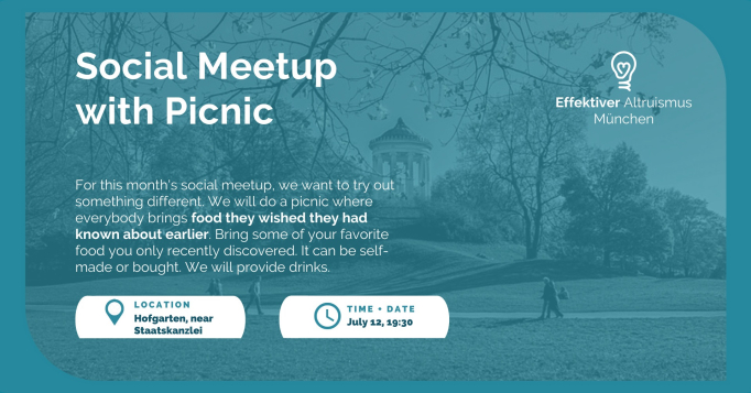 For this month's social meetup, we want to try out something different. We will do a picnic where everybody brings food they wished they had known about earlier. Bring some of your favorite food you only recently discovered. It can be self-made or bought. We will provide drinks and cutlery. If you have some, it would be great if you could bring along some picnic blankets to sit on.