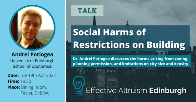 Andrei Potlogea will discuss the potential harms arising from zoning, planning permission, and other limitations on how large and dense cities can be. He considers whether these restrictions are one of the largest problems faced by developed countries, and whether mitigating these restrictions is one of the higher value issues that EAs might work on.