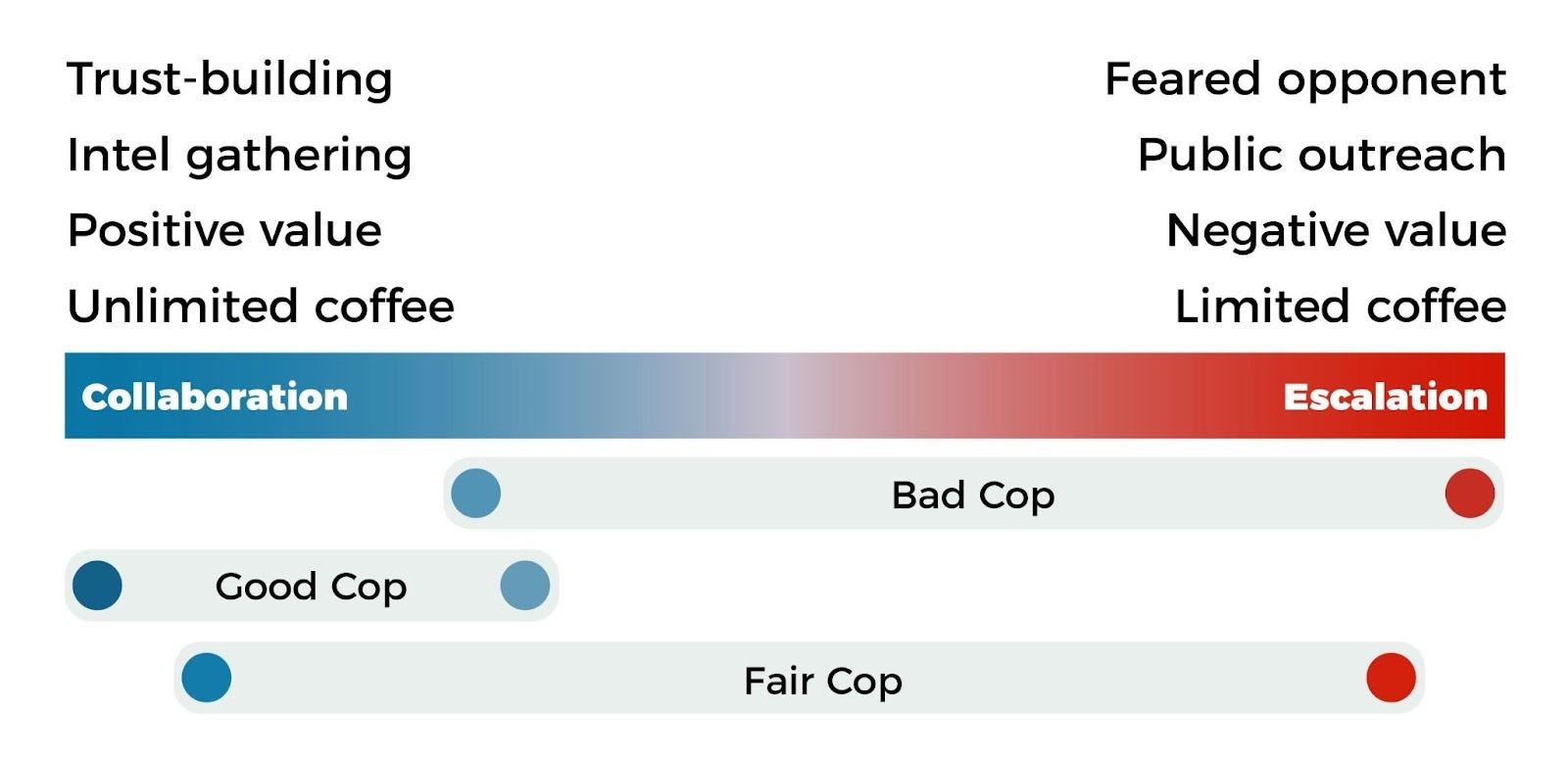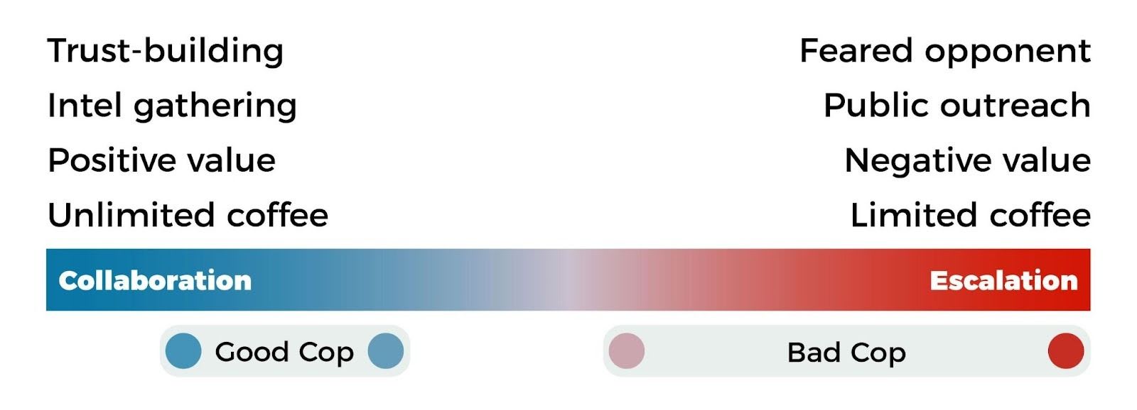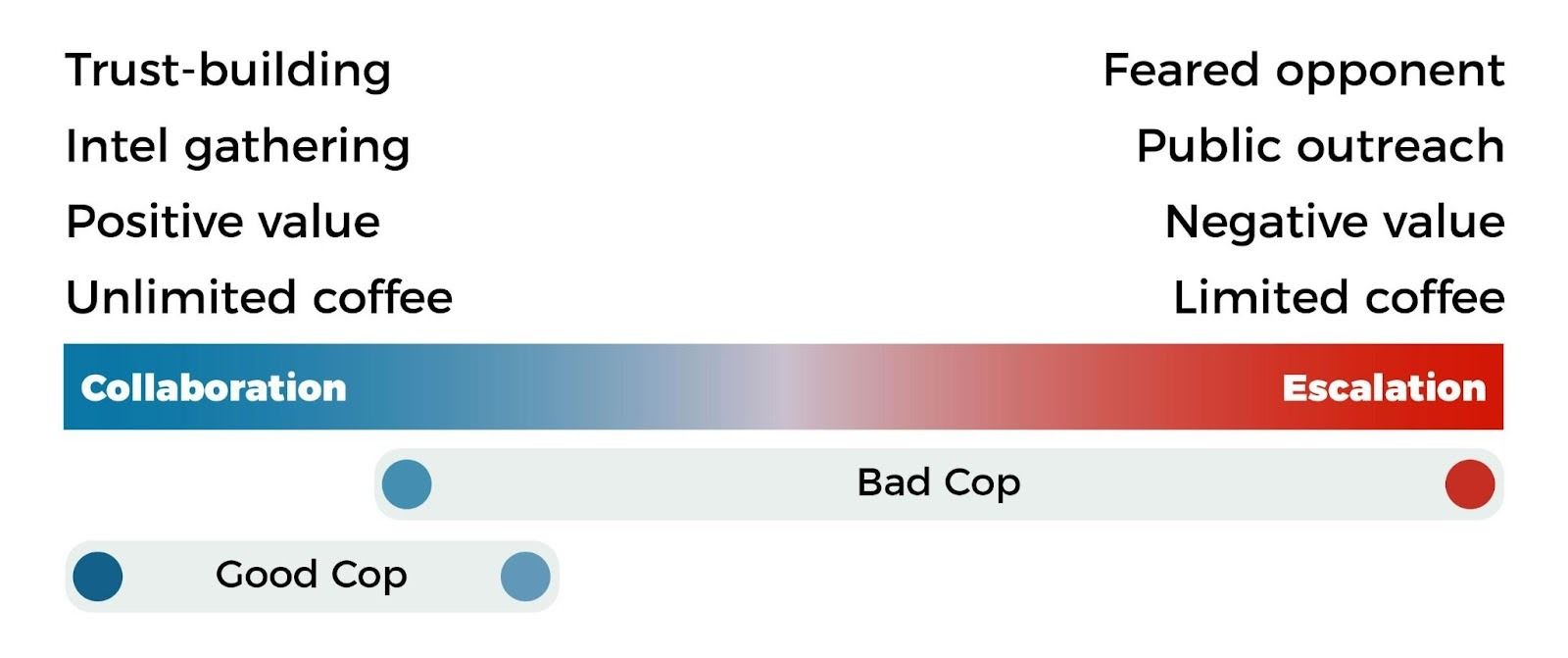 Another issue relates to coordination costs. If the good cop and the bad cop are working together, a lot of alignment work may be required, and disagreements around strategy or tactics can also arise.