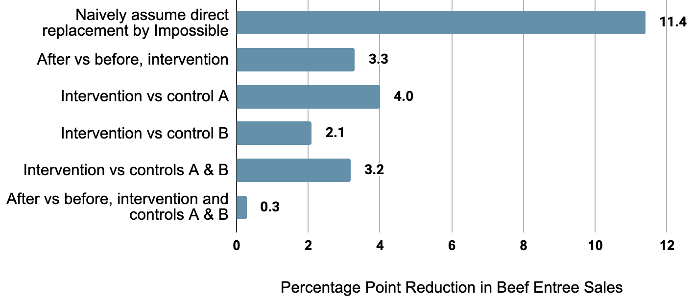There are six different ways the impact could be measured. It is unlikely that each impossible purchase directly substituted for beef, considering options to switch from veggie meals instead or switch dining halls. - Surveys show that reaching price parity matters. But I think many people assume that if we reach price parity or better, alternative proteins are almost certainly going to achieve mass market success. I think this is a misunderstanding of consumer demand; demand only increases a finite amount for price decreases. At a certain point, more expensive goods are bought because of perceptions related to branding or status (however nonsensical these perceptions are). If the prior study is not sufficiently convincing, I think people should reflect more on the basic economics at play here. High income countries and individuals are not highly responsive to changes in food prices. As incomes rise, people spend less disposable personal income on food. Population aging also contributes to lower income responsiveness. If we expect AGI to result in some considerable economic boon in a few years, we should expect people to care even less about price.