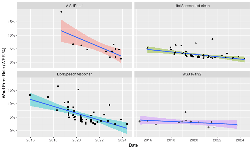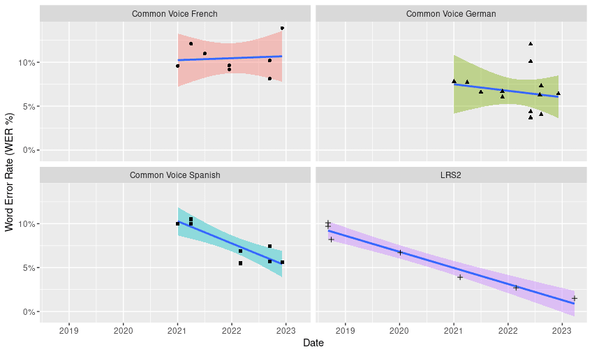Table 1. Trend adjustments for different speech recognition benchmarks. The sample sizes, summary of the adjusted models, determination coefficient, and rate of change in months are shown (which is the value that the variable x has to take for there to be a decrease of one unit in y e.g. Common Voice Spanish y = 24.28- 0.2(5) = 23.28). Normality and variance homogeneity tests can be consulted in the supplementary material.
