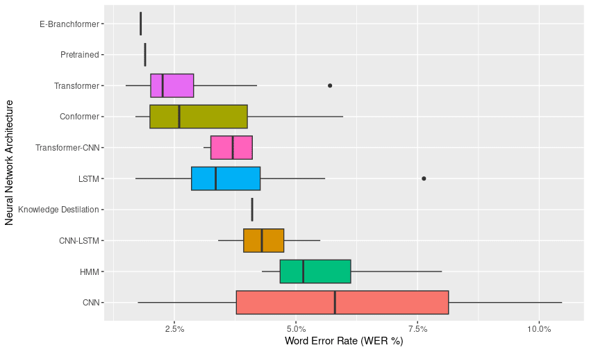 Table 3. Descriptive statistics regarding the Word Error Rate (WER%) by type of neural network architecture. The total number (n), minimum (min), maximum (max), mean, and standard deviation (sd) of the WER metric for different neural network architectures in speech recognition models are shown.