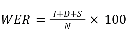 The WER (Word Error Rate) metric is the standard used to evaluate the performance of large-vocabulary continuous speech recognition systems. The number of errors is calculated as the sum of substitutions (S), insertions (I), and deletions (D), divided by the total number of words (N) and multiplied by 100: