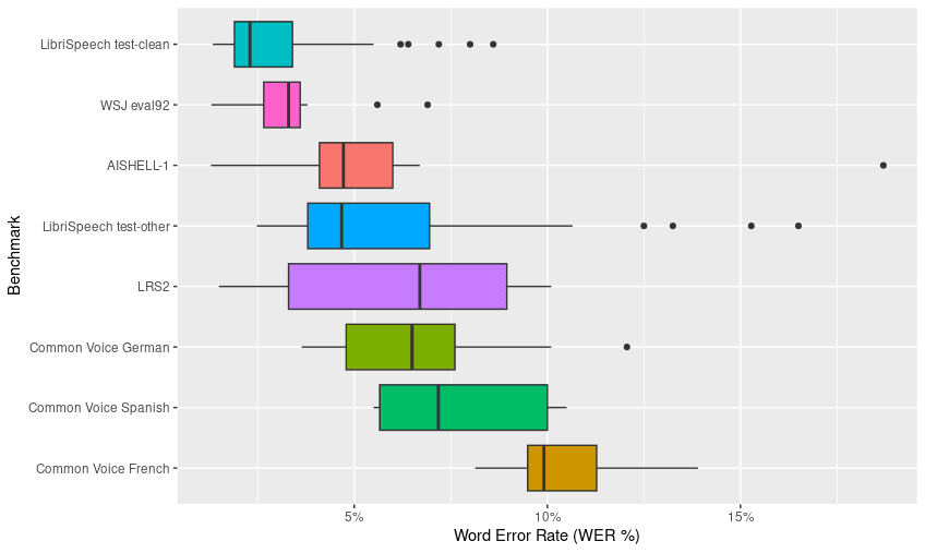 According to the exploratory analysis of the constructed dataset, it was found that the Common Voice French benchmark (WER 10.5%) and Common Voice Spanish benchmark (WER 7.5%) show the highest word error rates. In contrast, the benchmarks with the lowest error rates were LibriSpeech Test Clean (WER 3%) and Wall Street Journal (WSJ 92) (WER 3.3%) (Figure 1).