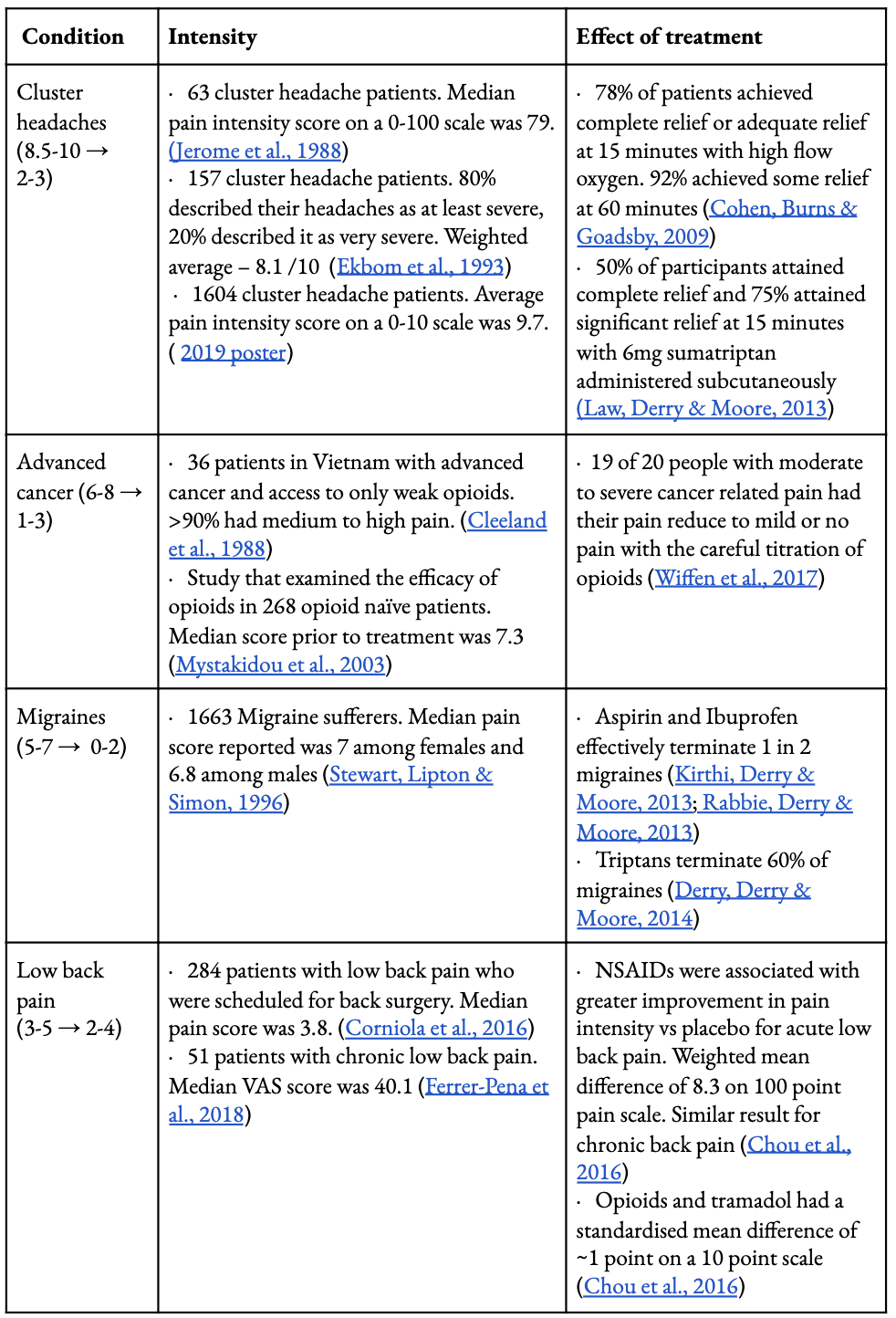 First, we consider pain from terminal conditions such as advanced cancer and HIV.[3] These cause intense suffering if untreated. If carefully treated with opioids[4], 95% of those with severe or moderate-pain report mild or no pain and quality of life greatly improves.
