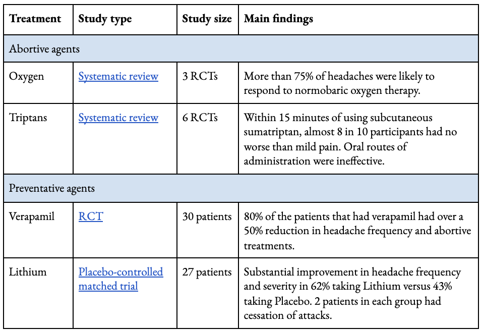 Pearson, S. M., Burish, M. J., Shapiro, R. E., Yan, Y., & Schor, L. I. (2019). Effectiveness of oxygen and other acute treatments for cluster headache: results from the Cluster Headache Questionnaire, an International Survey. Headache: The Journal of Head and Face Pain, 59(2), 235-249.