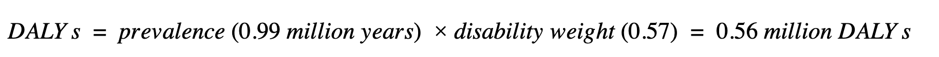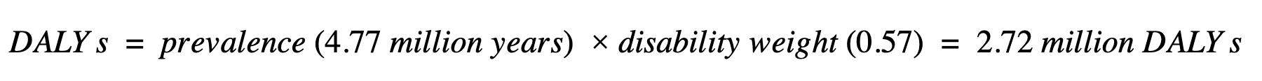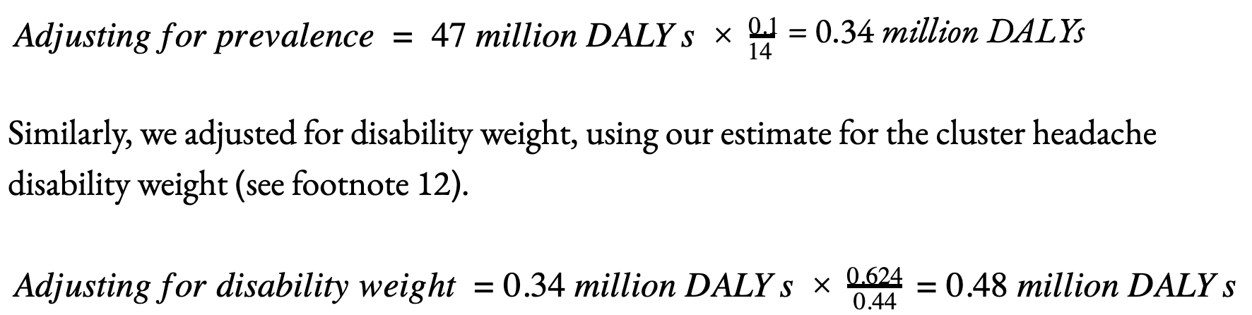 To estimate the global DALYs for cluster headaches, we use the global DALYs for migraines as a reference point. To adjust for prevalence, we multiplied migraine DALYs (47 million) by the ratio of the prevalence of cluster headaches (0.1%; Ekbom et al., 2006; Leone & May, 2020) to migraines (14%; Stovner et al., 2018), naively assuming that the active headache time period the demographic distribution and age distribution is equivalent for migraine and cluster headache sufferers.