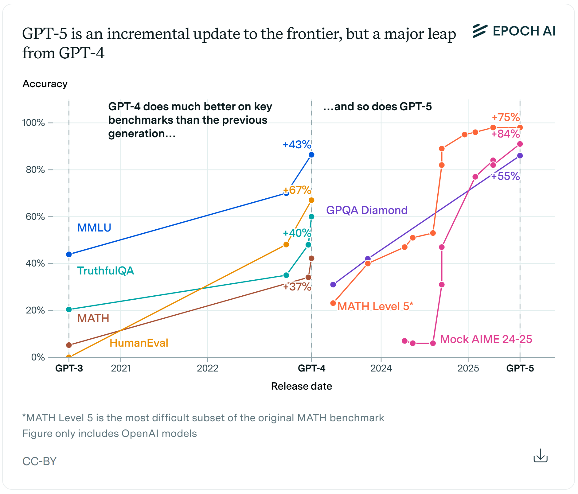GPT-5 and GPT-4 were both major leaps in benchmarks from the previous generation