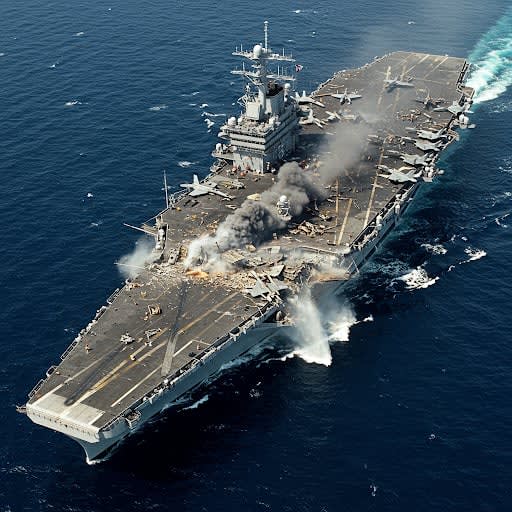 Meanwhile, the PRC craters the ship that launched the attack. U.S. vessels flee Westward, racing to escape the range of long-range missiles. Satellites drop from the sky. Deck hulls split as sailors lunge into the sea.