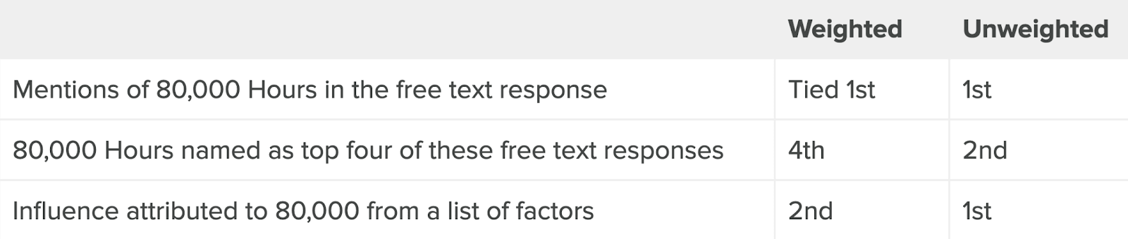 - When respondents were prompted to assign influence to a list of factors, 80,000 Hours was the 2nd most influential factor.