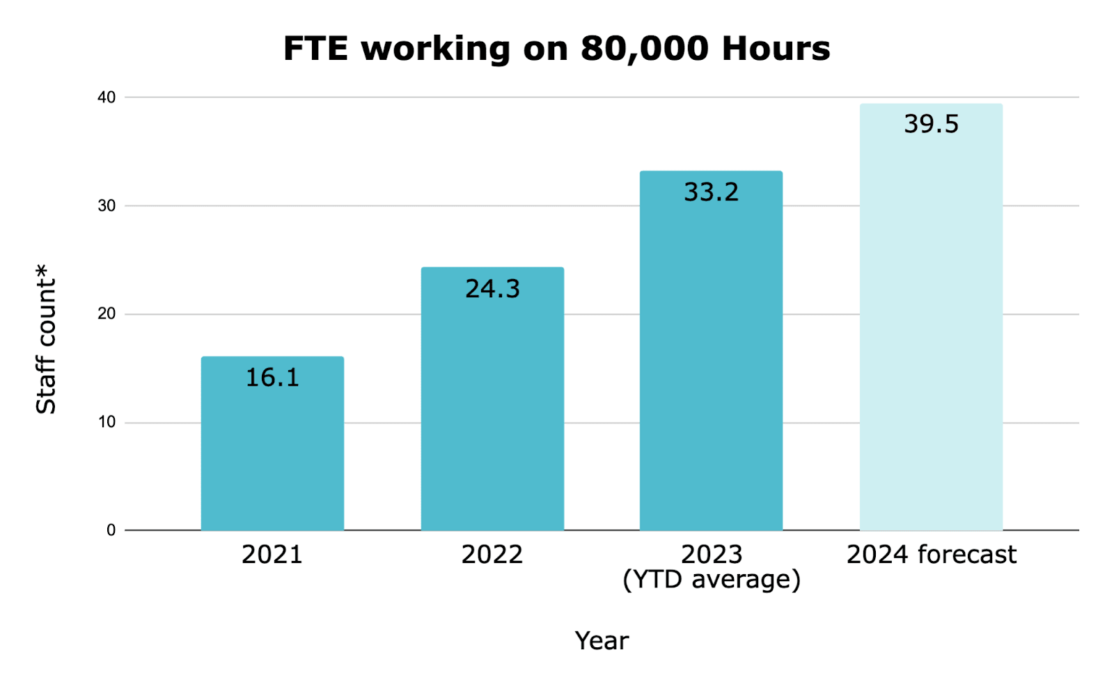 As staff costs take up a large proportion of our budget, here is a visualisation of the full-time-equivalent staff working on 80,000 Hours and our forecast for 2024: