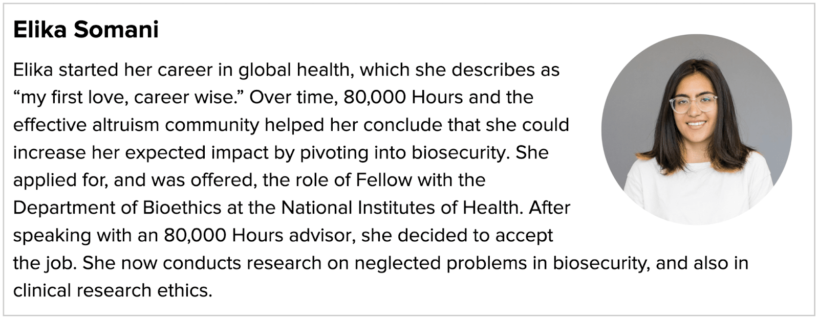 We call these plan changes. Because careers are so long, we think an average plan change influences how someone spends tens of thousands of hours. We estimate that this is equivalent to hundreds of thousands of dollars worth of value to the world over the course of each person’s lifetime.