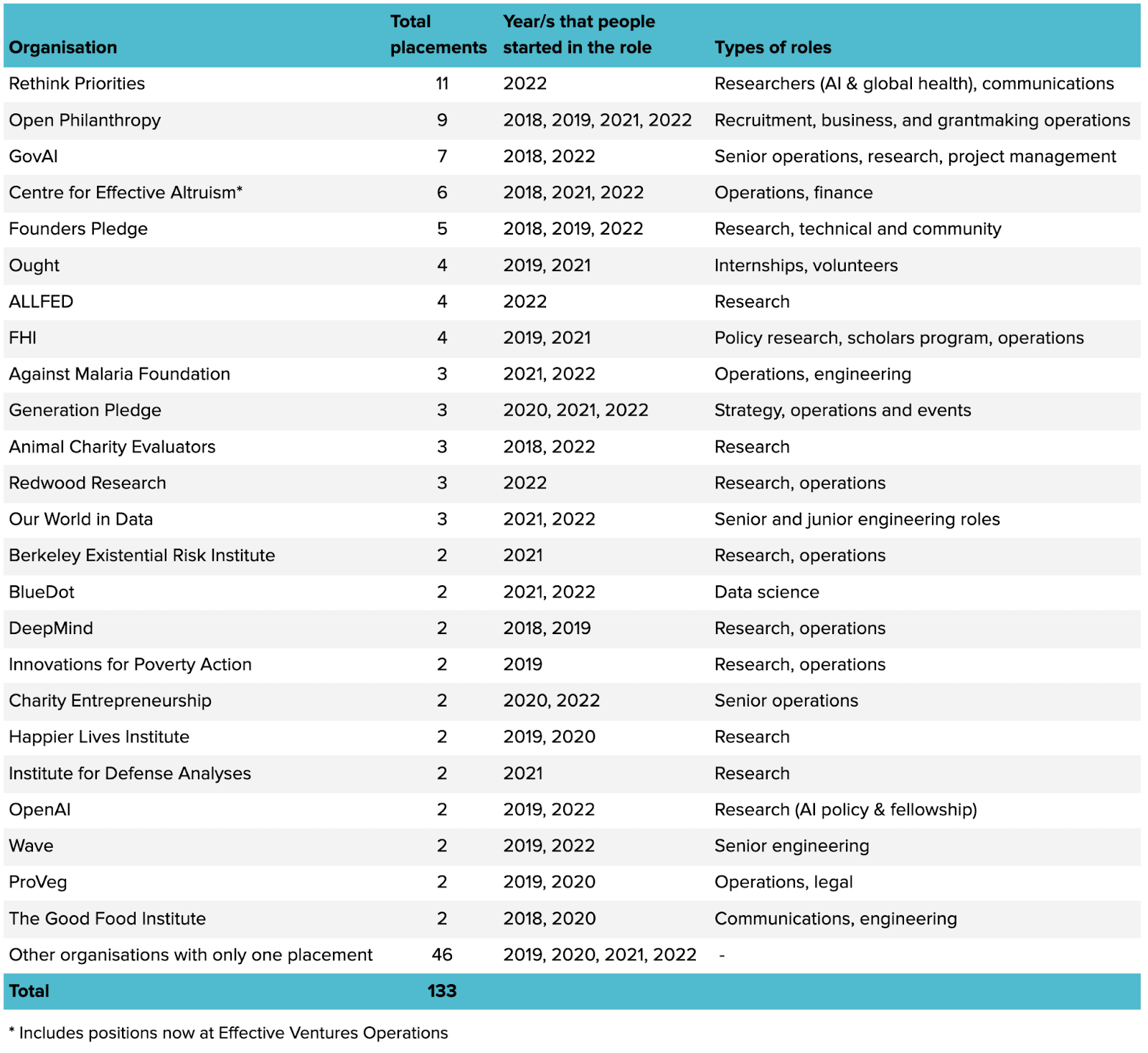 The table below shows some of the roles people have found on our job board — though we expect this to underestimate the true number of placements attributable to us.
