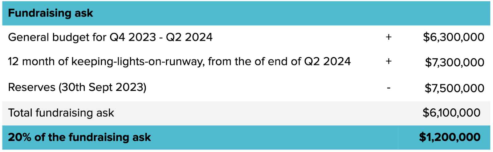 - We currently aim to keep 12 months of “keeping the lights on” runway in reserves, because it’s difficult to change our income and expenses quickly. Through some underspend and reduced expansion in 2023, our existing reserves already cover the runway for the 12 months after Q2 2024, so we’re not fundraising for this now. Our reserves also slightly reduce the amount we’re asking for from our budget — which you can see in the tables below.