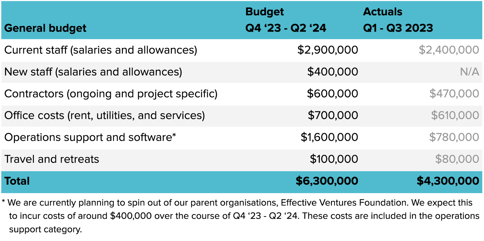 - 20% of our general budget for that period — we’ve already fundraised for 80% of our general budget from Open Philanthropy, so we’re fundraising for the final 20%. We value having diverse funding sources and are excited to grow our network of donors.