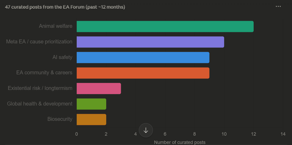 - (Very uncertain) Perhaps Global welfare folks might feel less welcome here than in the past? I feel this a little myself. When I look at the front pages I behold a sea of AI and animal welfare, it doesn’t feel like my intellectual “home” any more.
