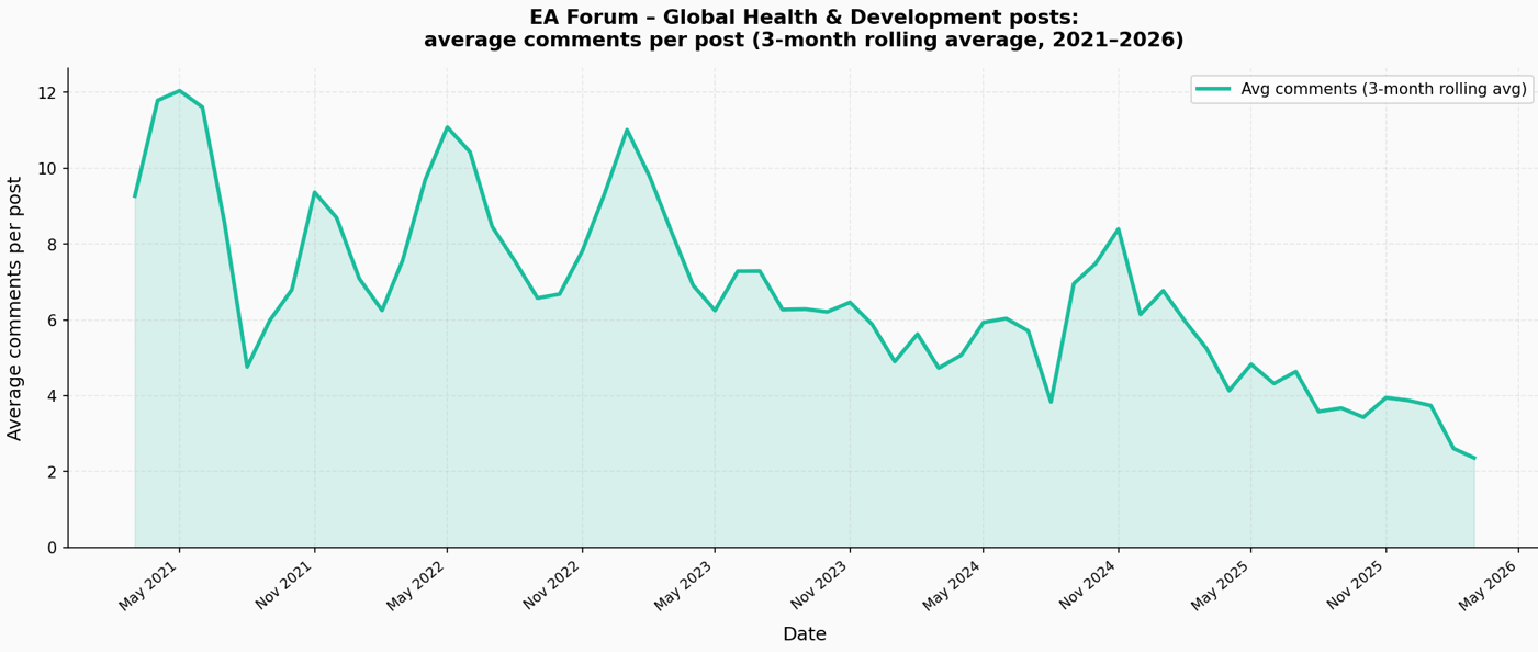 - Much GHD prioritisation has been "solved", so there's less to discuss? I don't buy this so much as there have been many large funding shifts within GHD, for example a big shift towards more speculative / systems change work. Plenty to discuss here!
