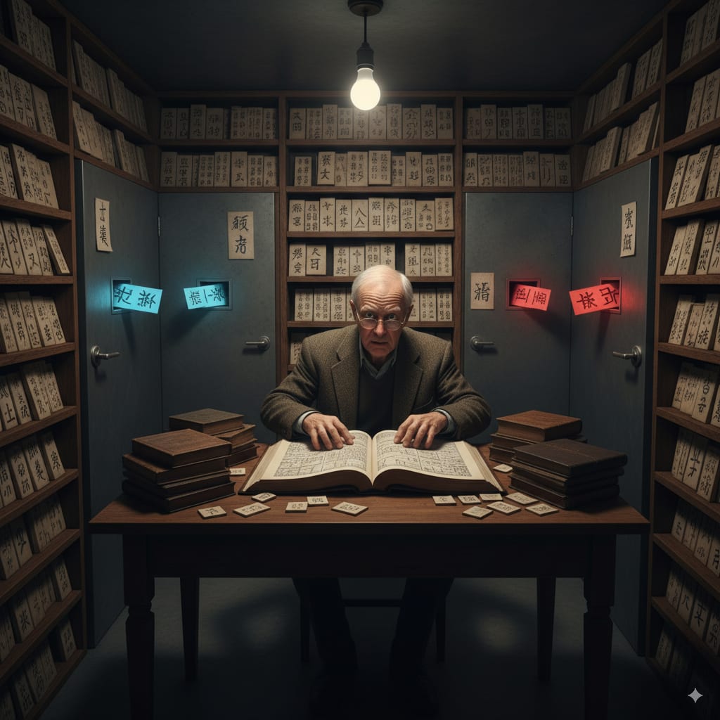 In the thought experiment, Searle imagines himself sitting in a room receiving Chinese characters that are passed under the door. He consults a set of rules/instructions to manipulate and transform the symbols and passes Chinese characters back under the door. To an outside observer, the room produces fluent Chinese, yet Searle sitting inside the room does not actually understand Chinese.