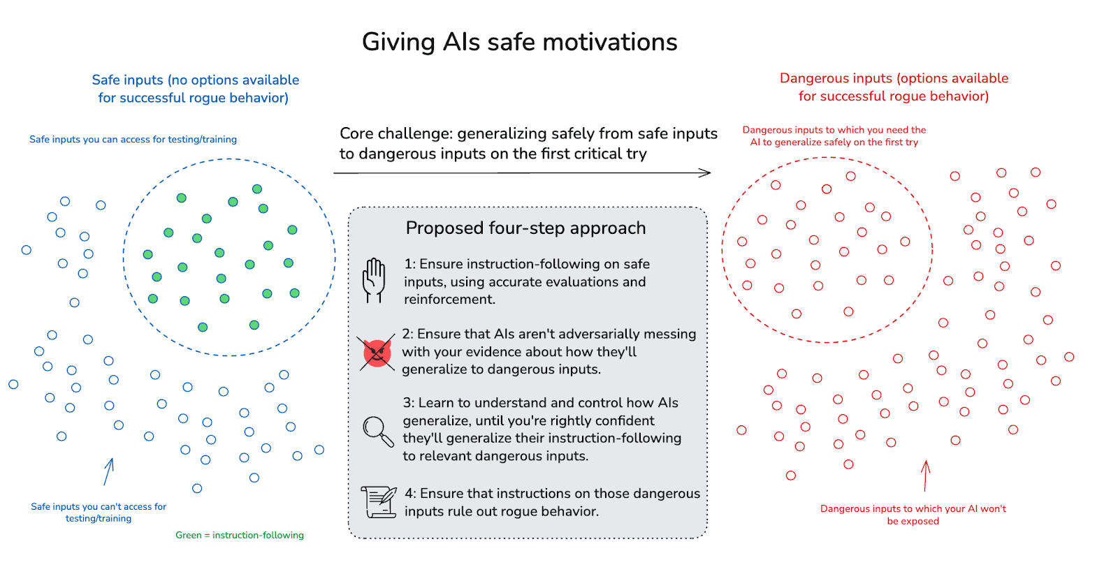 In “Giving AIs safe motivations,” I discussed what I see as the main challenges at stake in developing a science of non-adversarial generalization adequate to handle the safe-to-dangerous leap. I won’t review that full discussion here, but example issues include: