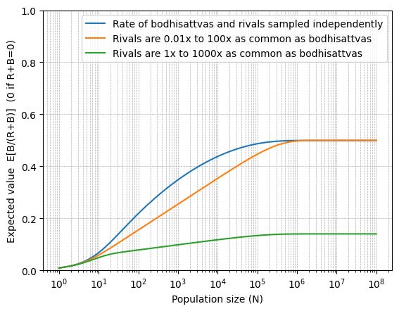 - So in expectation, the bodhisattvas get p/(p + q) of the total available value, where p is the rate of bodhisattvas and q is the rate of rivals.