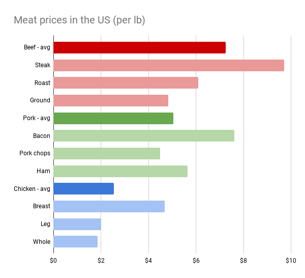 An important aspect of the dynamic between beef and chicken is that chicken is roughly 3 times cheaper than beef, on average. There are many reasons for this, one being that feed is around 70% of the cost of meat, and chickens more efficiently convert feed calories to meat. A further reason is that chickens don’t have the same protections as cows do. Animal agriculture is generally highly optimized and high-throughput, meaning that any small change can affect the price. For an example in a slightly different context, California’s cage ban on eggs from caged hens increased the price by 72 cents per dozen, which is impressive considering that national prices hover around $1 per dozen.
