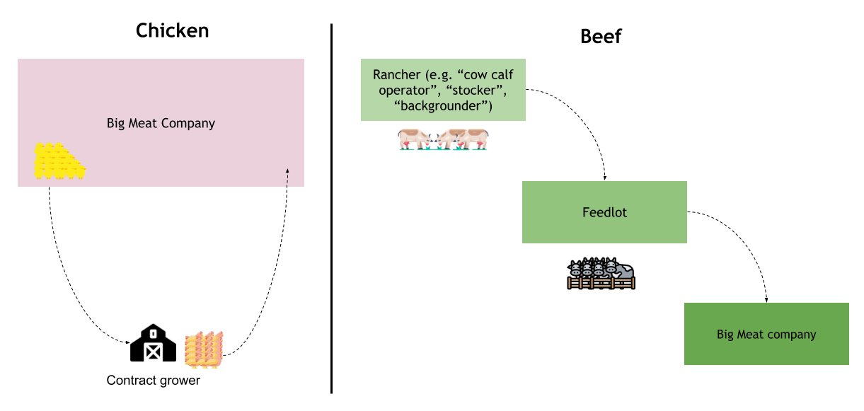 One might worry that since the big meat companies all operate across chicken, pork, and beef, it may be difficult to get different parts of the sector to work against one another. However, the beef industry is structurally unique in that there are many different players with differing incentives.