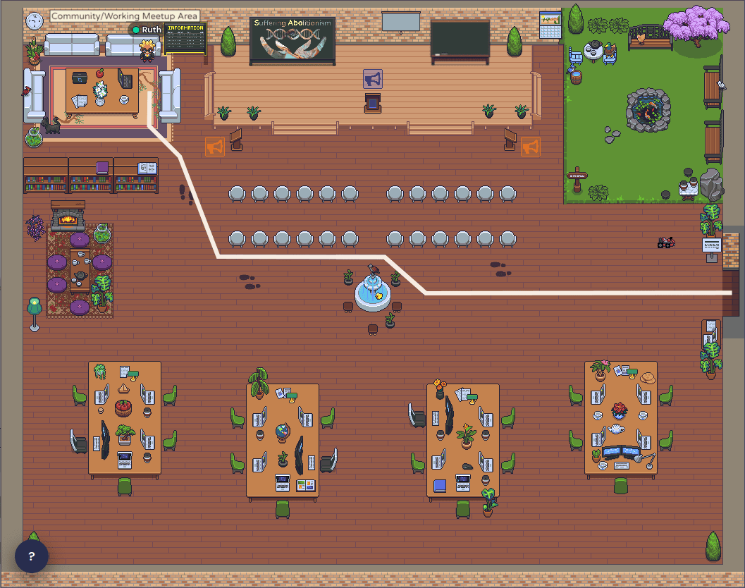 We will meet in our Suffering Abolitionist Hall (upper left corner) in EA Gather Town. See Hall map below.