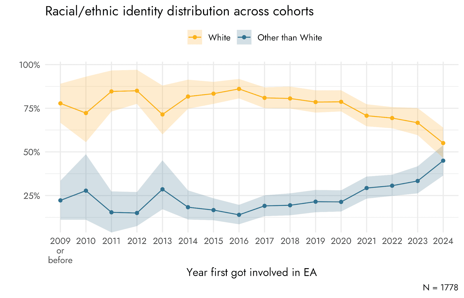 But the newest cohort (people who got involved in EA during the last year as of the 2024 survey) is markedly more racially diverse, and more diverse than the newest cohort was in the 2022 survey.
