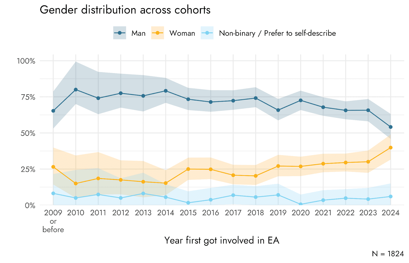 2014-2024: EA Survey participant ratios have gone from about 75% male in early years to about 69% male over the last 6 years.