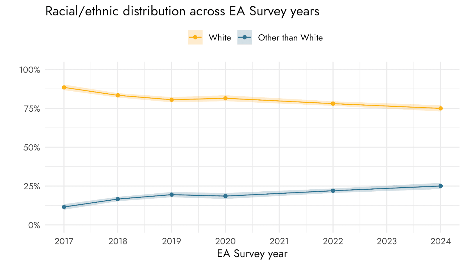 The population filling out the EA Survey has become slightly less white over time.