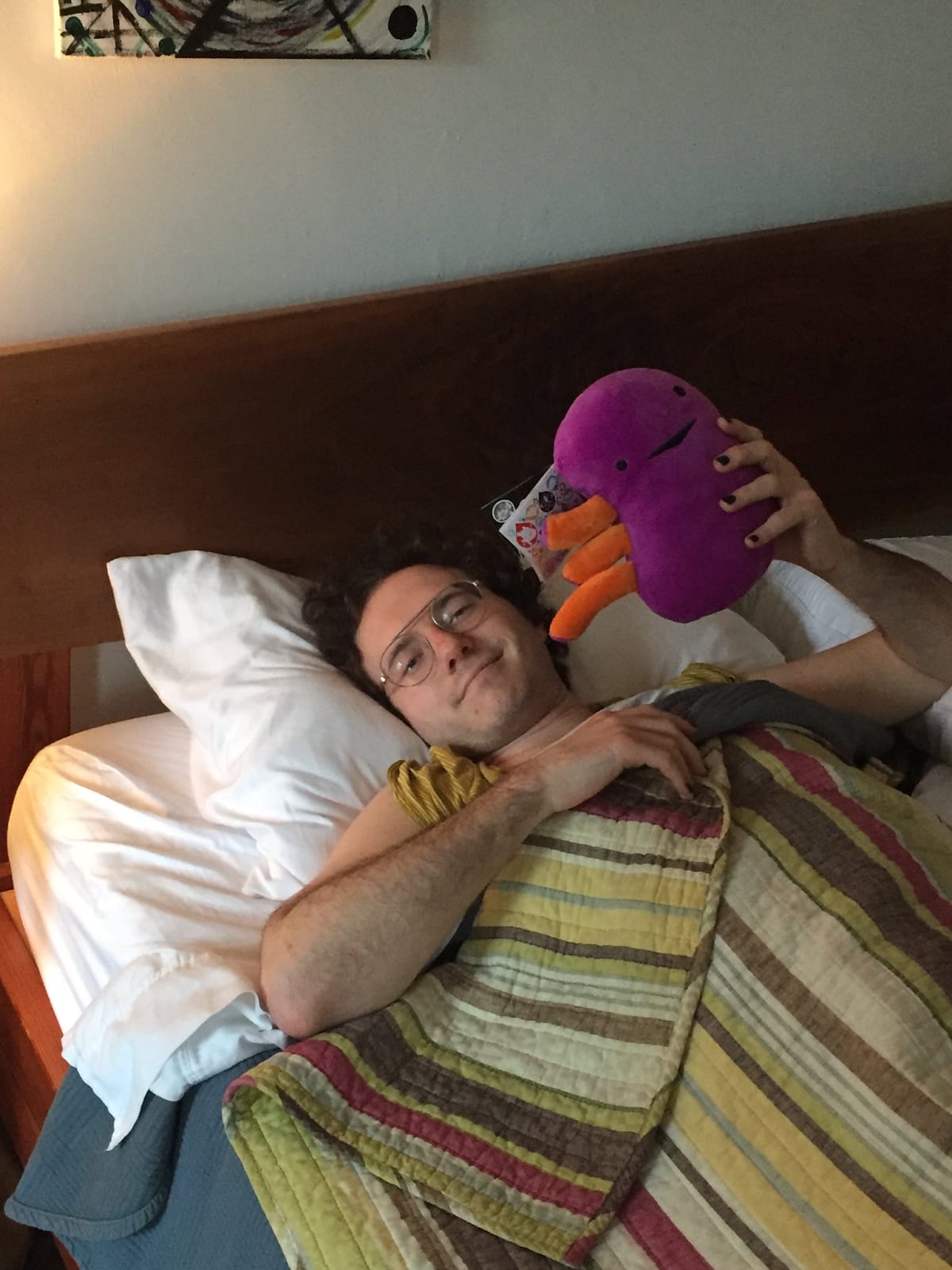 I want to introduce you to the first journey by introducing you to Quincy: they're a grants associate at Effective Ventures, which is an umbrella organization for many EA-affiliated organizations like CEA, EA Funds, and Giving What We Can. Those of you who have received money from one of those organizations may have Quincy to thank for that money arriving in your bank account. Quincy is holding up something incredibly cute that I assume is supposed to be a kidney, because they're in bed recovering after donating their kidney to a total stranger.