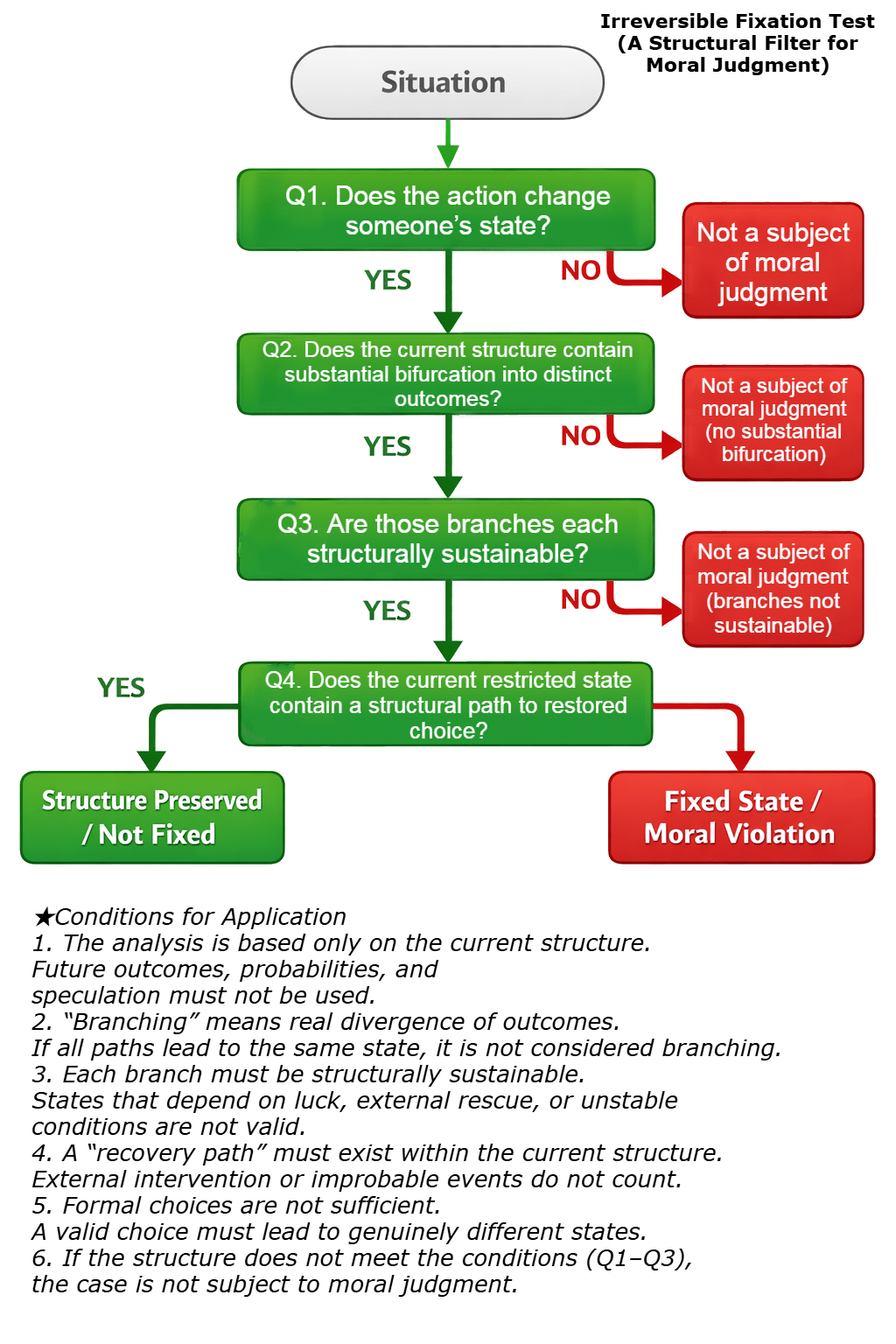 Unlike traditional approaches that depend on unobservable variables such as intent or uncertain future outcomes, this model evaluates systems based on structural reversibility. A moral failure is defined as irreversible fixation: a condition in which a system eliminates an agent’s viable alternative paths and forces a single non-divergent trajectory.