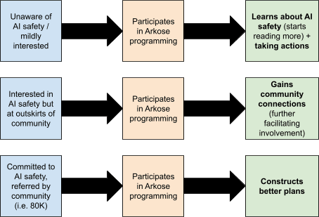 The chart below outlines the main subpopulations of ML professionals that Arkose supports, and the outcomes we aim to achieve with each subpopulation.