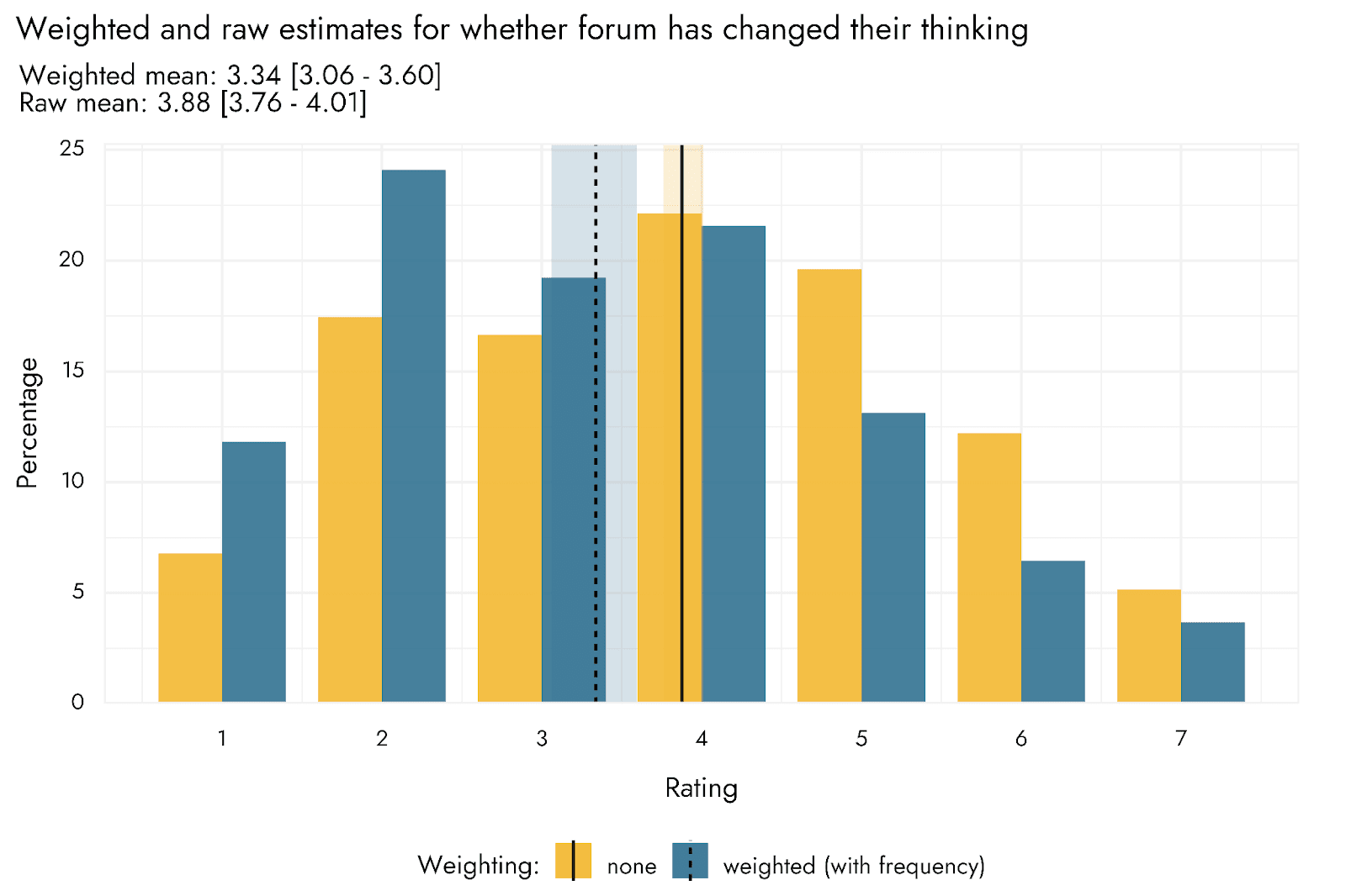 - A plurality (around 45%) of respondents said they visit the Forum about 1-2 times a week. This is more frequent than the overall Forum population, so reweighting decreases things like the percentage of users who applied for a job due to the Forum, and the mean rating of “significantly changed your thinking”.