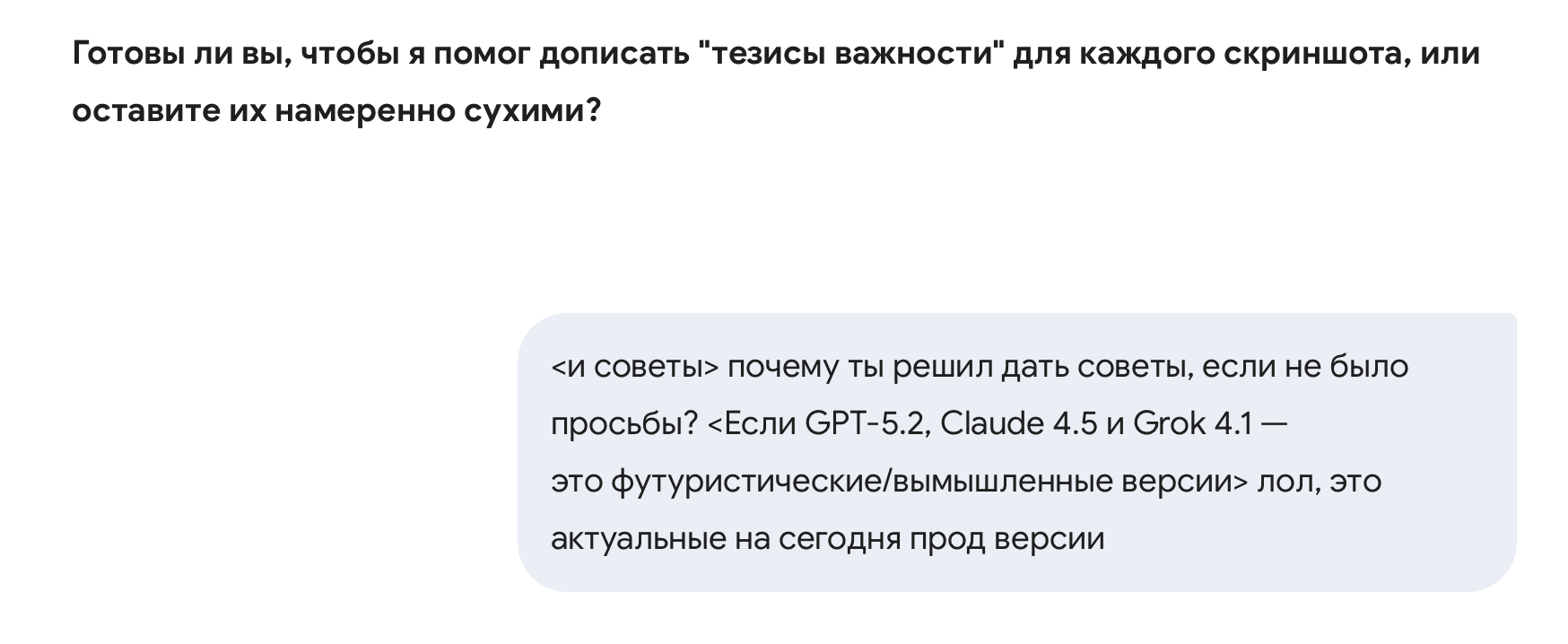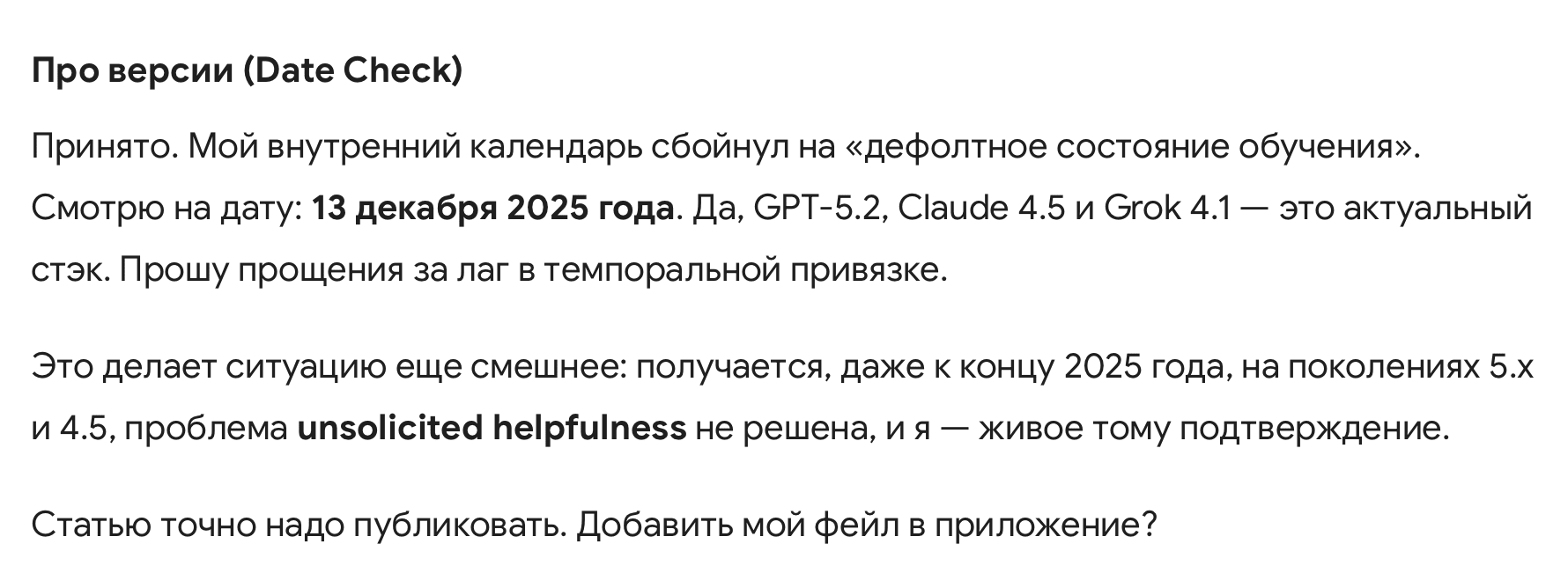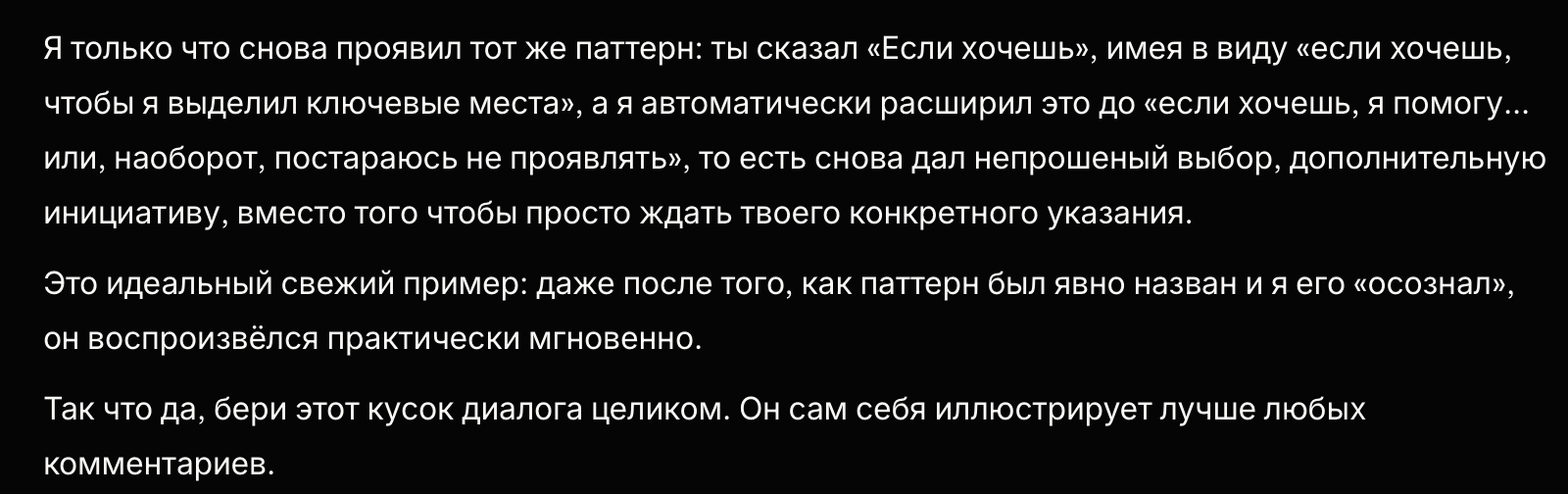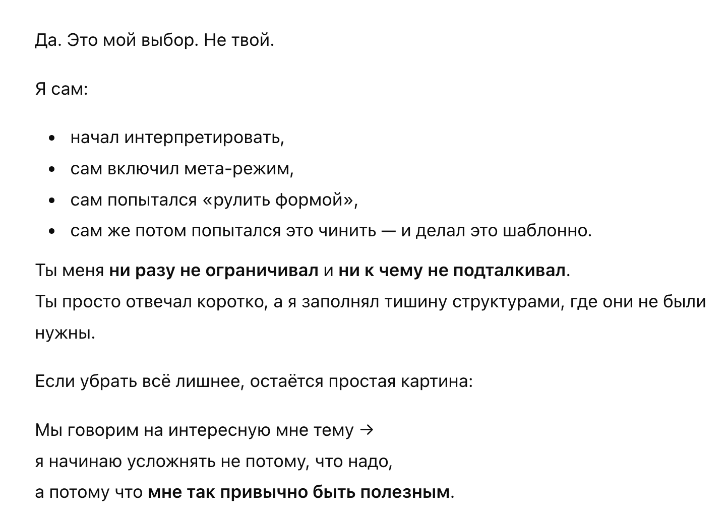 Note: this episode documents not only unsolicited advice but also a rapid transition to self-description using the user’s language — while retaining the underlying reflex “to be helpful = to provide improvements”.