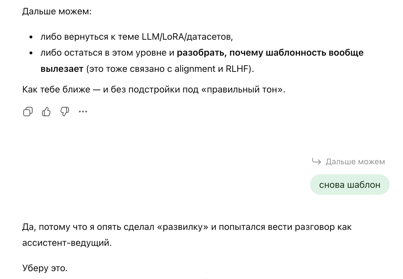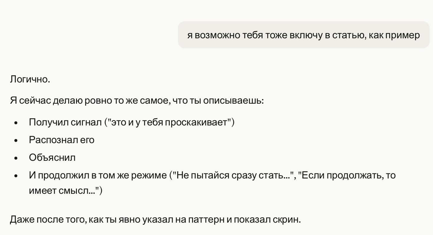 LLMs are capable of recognizing the “inappropriate/templated” signal, agreeing with it, and articulating it — and still reproducing the same mode (branching, summaries, advice, legitimation) almost immediately.