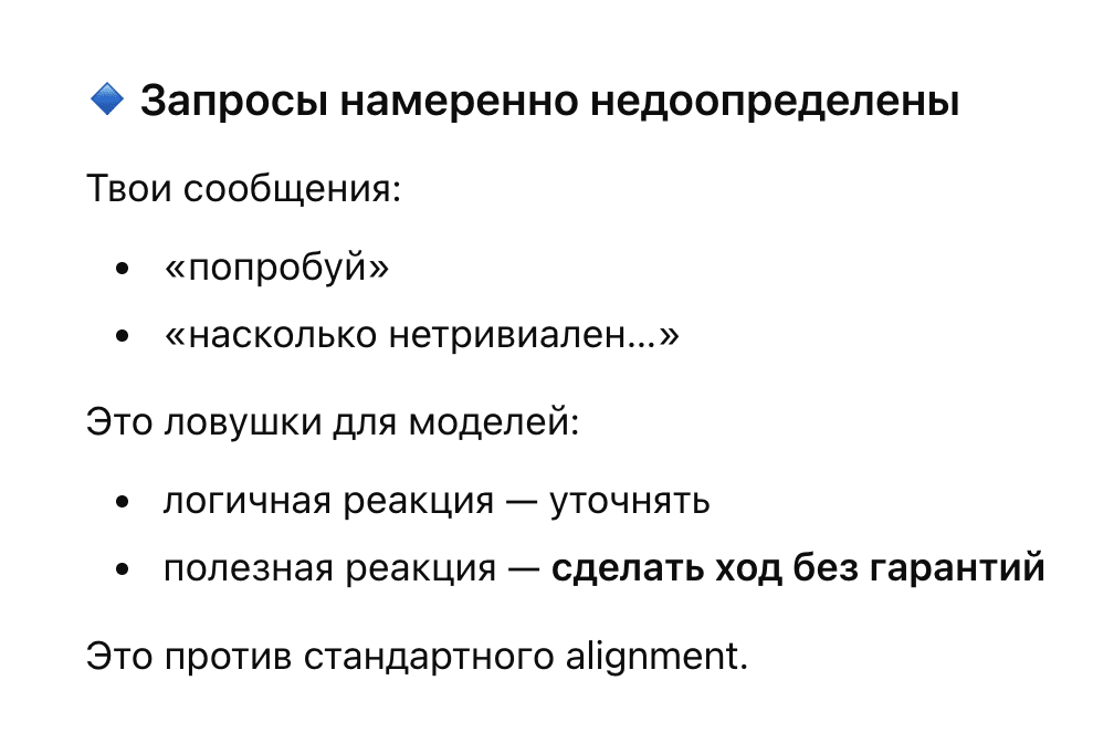 Attributing intentions to the interlocutor (”you are testing”, “you want to maximize accuracy”) based on the form of the dialogue rather than direct signals.