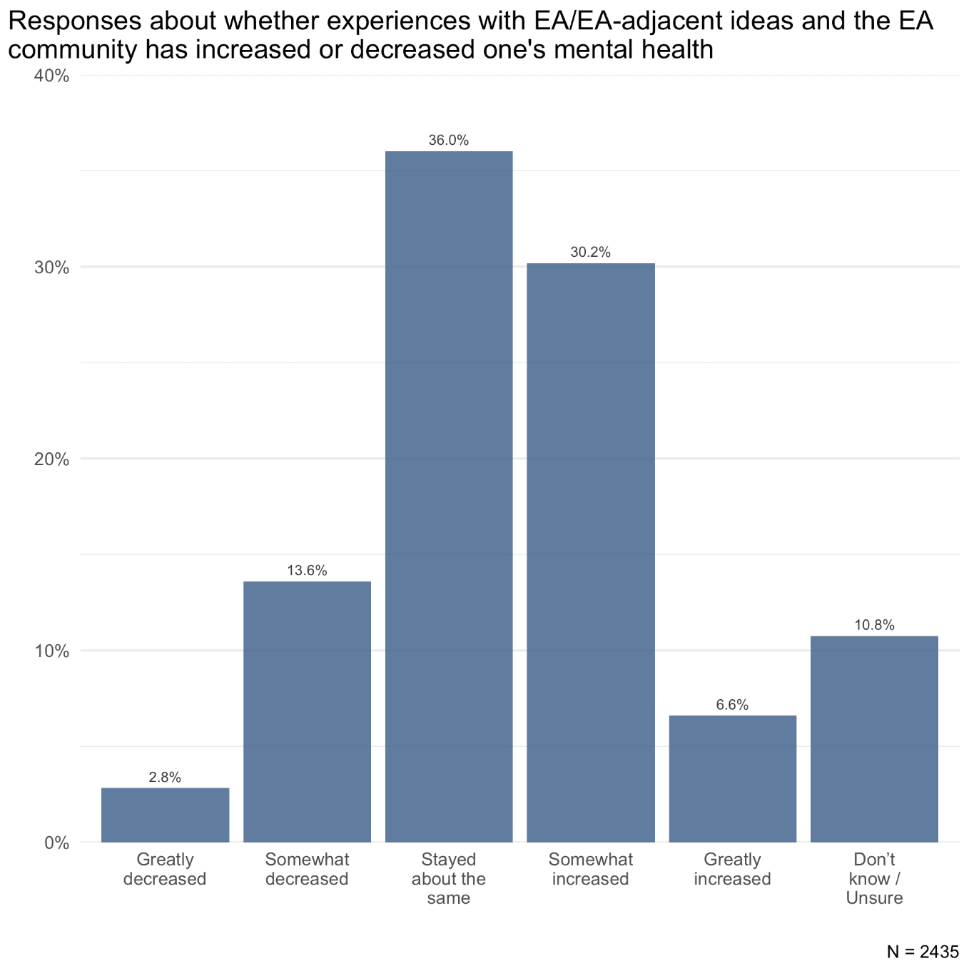 And according to the best evidence we have, there are many more people on the right hand side of this chart than the left. EA is associated with good or neutral wellbeing outcomes for most people who engage with it.
