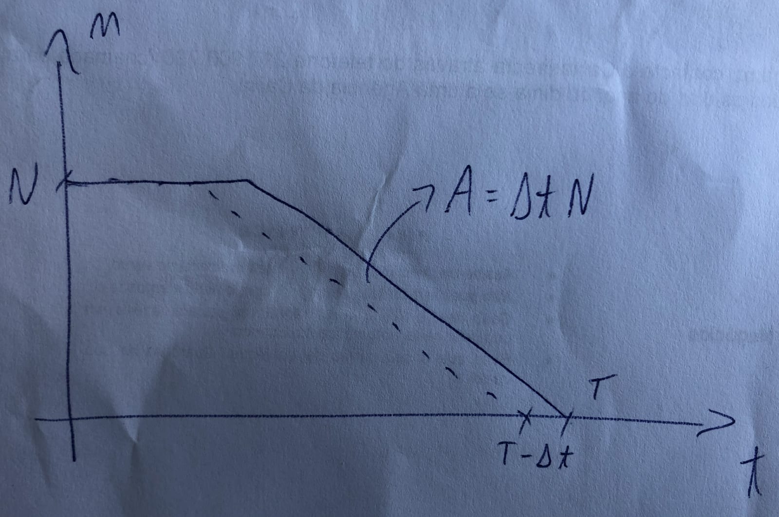 Using these formulas makes sense if each level of implementation of the reform is accelerated as much as its full implementation. I illustrate this case below. The full and dashed lines represent the (expected) population of animals in the baseline conditions without and with the intervention. Without the intervention, there would be no animals in the baseline conditions after years. With the intervention, there is an acceleration of not only that, but of the whole trajectory of the population by years. The animal-years improved are given by the area between the lines, which is “acceleration in years of the full implementation of the reform ()”*“initial population of animals in the baseline conditions ()”, as in the 2nd formula above.