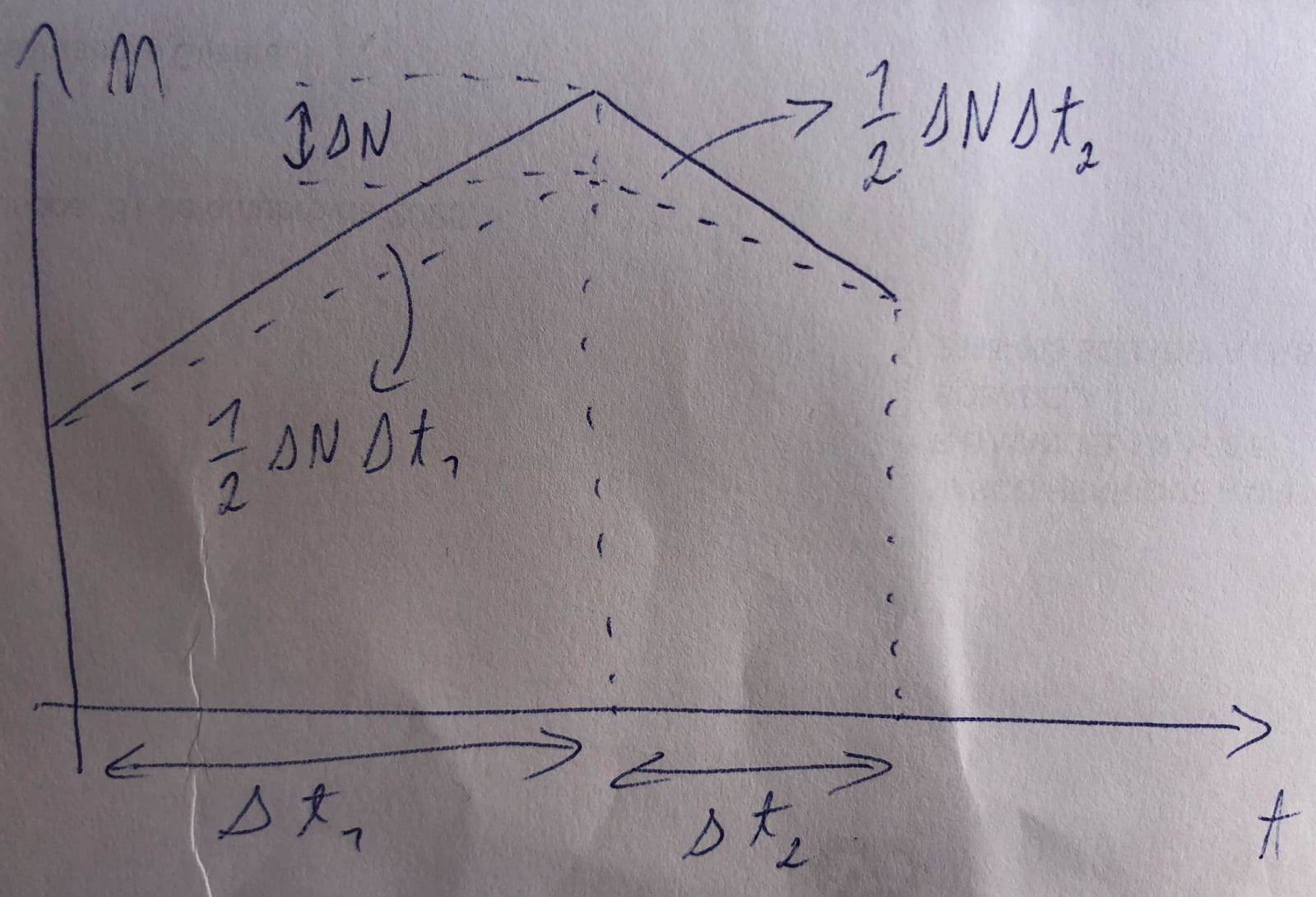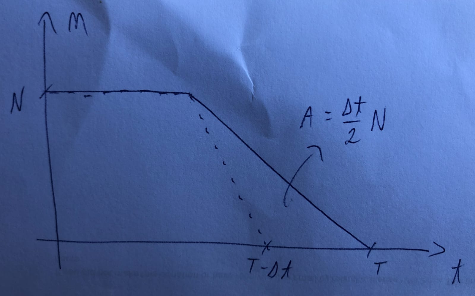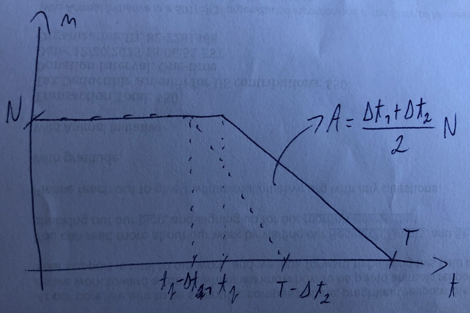 An intervention can also accelerate the full implementation of the welfare reform after flattening the growth of the population of animals in the baseline conditions. I illustrate this case below. As above, the intervention decreases the peak population by , which is reached years after the intervention starts to have an effect. In addition, it accelerates the full implementation of the reform by years, such that it happens years after the intervention starts to have an effect. The peak population would be N_p without the intervention. The animal-years improved are . I obtained this from adding the 2 expressions below, but then realised it can be directly inferred from the drawing. The 1st term is the area of 2 triangles defined by the points (, “initial population”), (, ), (, ), and (, ). The 2nd term is the area of a triangle defined by the points (, ), (, ), and (, ).