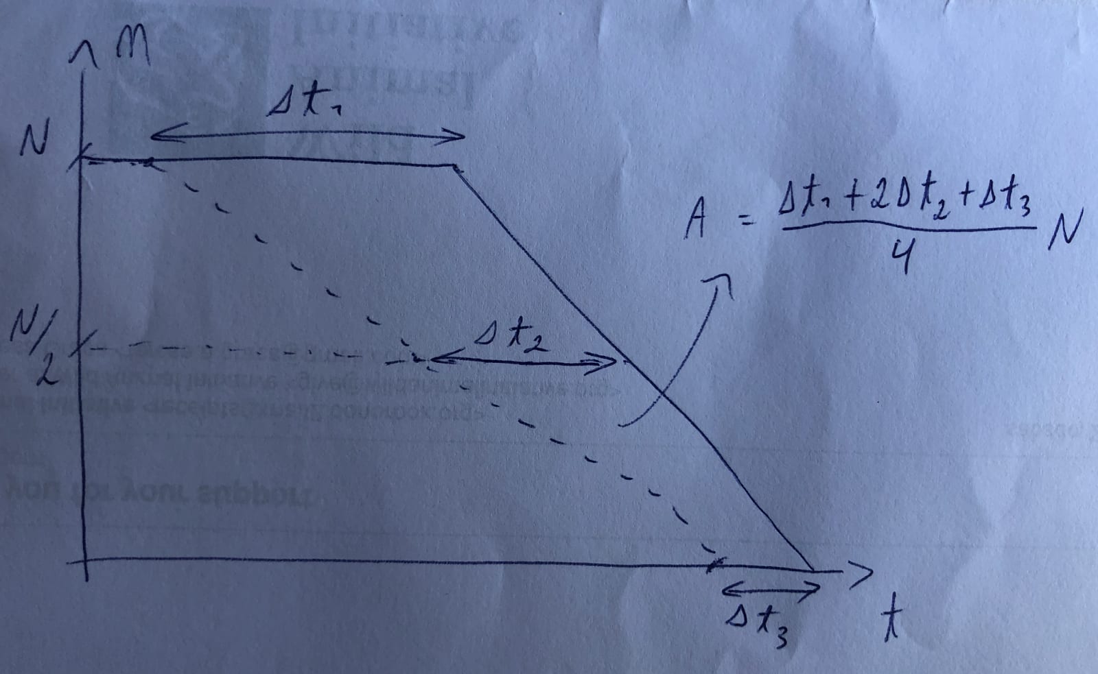 Generalising, for cases like the ones above, the animal-years improved are “mean acceleration over the population of animals in the baseline conditions”*N. Here is an example which I illustrated below. If the start of the implementation is accelerated by , the completion of half of the implementation by , and its full achievement by , the animal-years improved are . is weighted 2 times as heavily as each and because it affects the population both before and after that of half implementation, whereas only affects the population after the start of implementation, and only affects the population before full implementation.