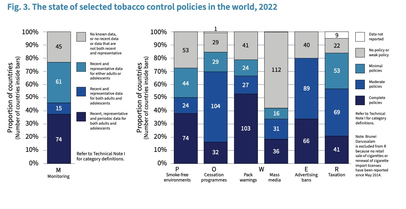 The number of countries that have adopted at least one MPOWER measure at the highest level of achievement has grown from 44 in 2008 to 151 in 2022. However, only a handful of nations have full compliance with MPOWER guidelines and 44 countries remain unprotected by any of the MPOWER measures.[5] Despite nearly every country signing the WHO’s treaty on tobacco, only 13 nations outside of Europe meet the WHO’s recommended minimum of taxing tobacco at 75% of retail value.