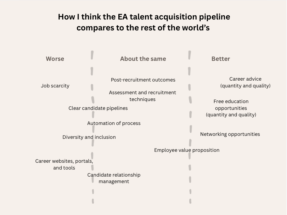 In other words: although the EA movement really values and believes in the power of leveraging careers for impact, the processes of talent acquisition within it are not much better than the rest of the world’s.