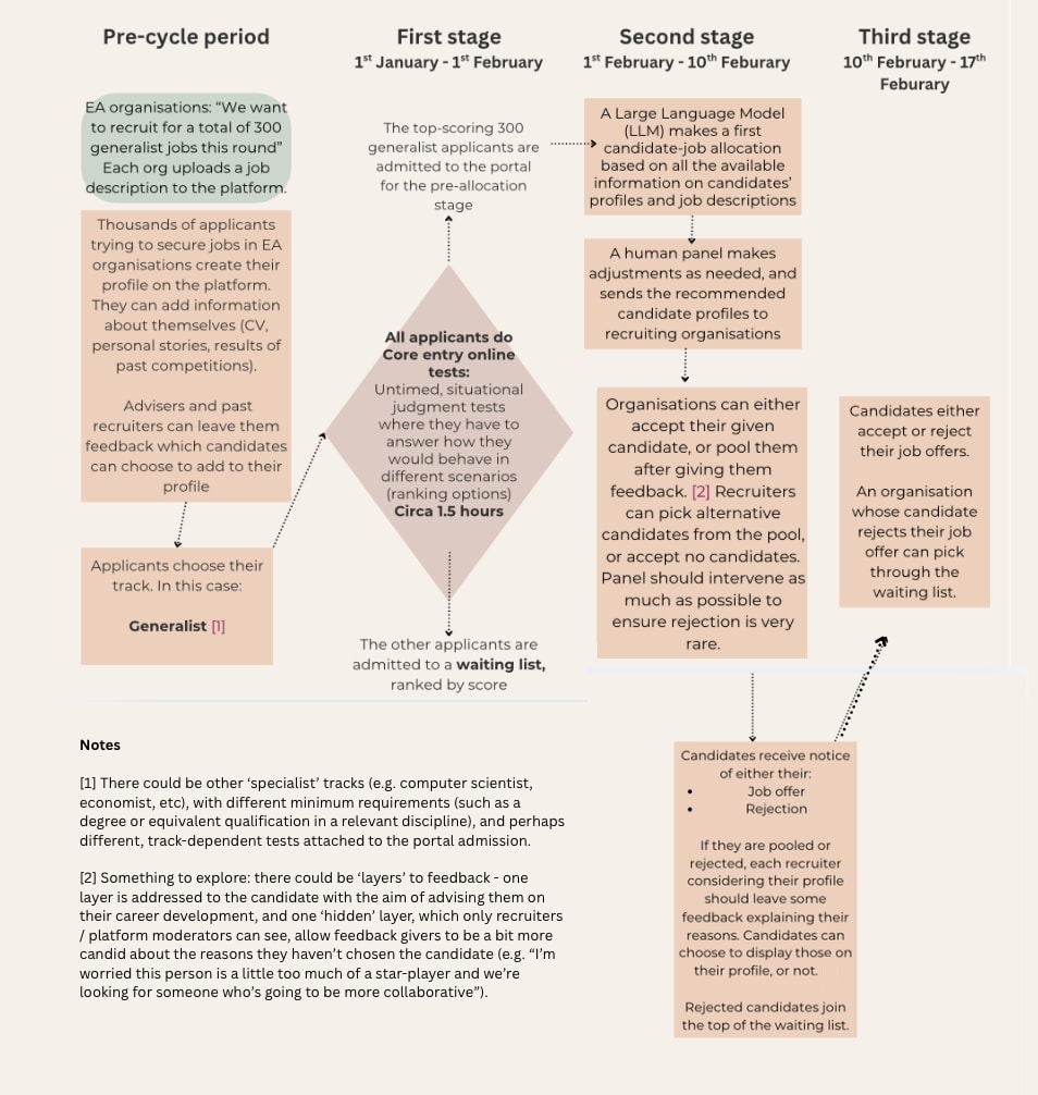 Proposal three: Facilitate the creation of a shared recruitment process across several EA organisations, consisting in competitive recruitment rounds utilising a single, ‘generalist’ application. This competitive process would only admit as many candidates as there are job openings. Successful candidates would be automatically considered for all the available jobs within a round and allocated one based on best fit. This would enable a situation where all selected candidates get a job. Unsuccessful candidates would still benefit somewhat since their test results would be saved on the platform (proposal one).