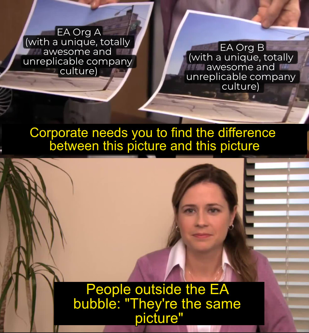 As per the argument that EA organisations have VASTLY different work cultures which makes it IMPOSSIBLE to recruit using the same processes… I think that’s probably not true: of course there are cultural differences from one EA org to the next, but I think they’re generally trivial enough that they don’t justify having separate recruitment processes. Yes, admittedly, by having separate processes, we might increase candidate fit to an organisation from like, 90% to 95%, but that trivial 5% extra fit factor to me doesn’t justify the astronomical loss of time that siloed recruitment processes inevitably cause.