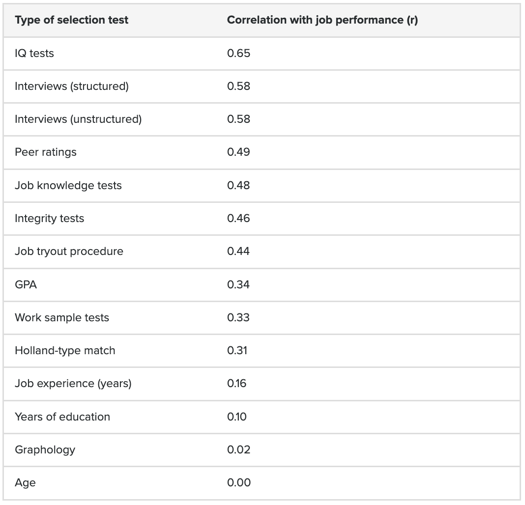 Even though it seems we are lacking a clear verdict from 80,000 hours on whether or not personality tests are good predictors of job performance, I would surmise that most recruiters do value having insights into the applicant’s personality, not so much because they think that’s necessarily linked to their ability to do their job properly, but because knowing about someone’s personality can help answer other important questions such as ‘will I enjoy working with this person / will this person enjoy working with me?’ or ‘what kind of things should I be doing to ensure this person is able to give their best / enjoy working / feels supported?’ etc. This may in turn heavily influence the decision to hire someone over another person.