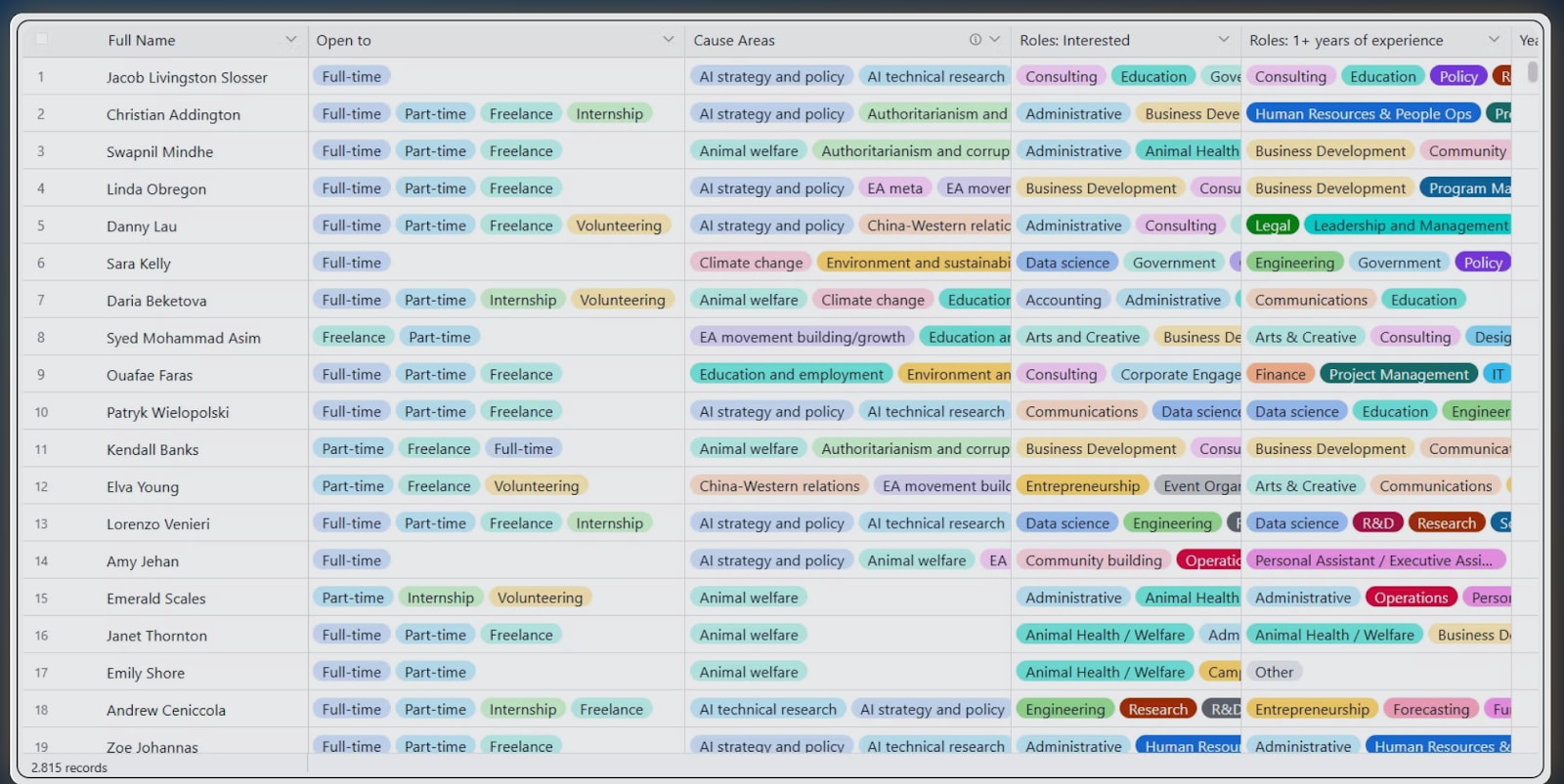 Essentially yes, what I am proposing is very similar to a collaborative spreadsheet on steroids (such as the HIP talent directory), but with a nicer interface (it would look like a website rather than a spreadsheet), an integration with an LLM that would make searching for candidates using various filters and complex combinations of filters much easier, and finally, would allow for the inputting of infinite amounts of datapoints (whatever the candidates feels relevant to mention, as opposed to whatever fields the spreadsheet ‘allows for’).