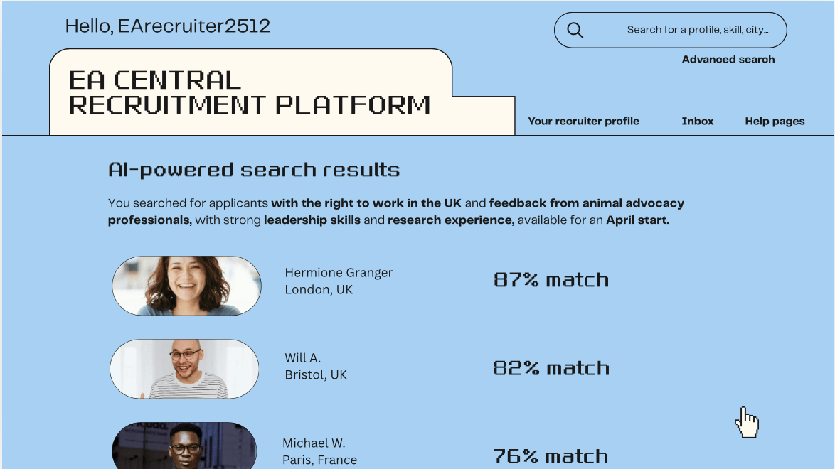 I don’t have the necessary knowledge to have a proper idea of how much such a website, which would need to include applicants profiles and integrate them all to an LLM able to carry out advanced searches using personalised filters (e.g. show me candidates with the right to work in the UK whose profile has been vetted by an animal advocacy professional) would cost to make. Any insights on this would be much appreciated.
